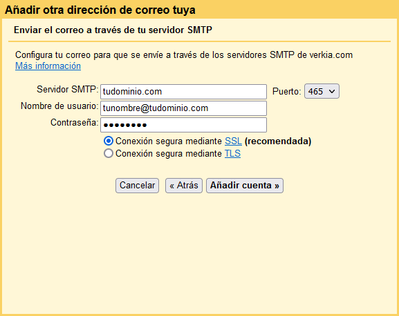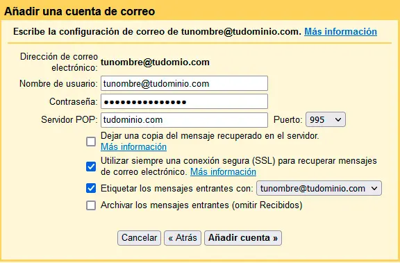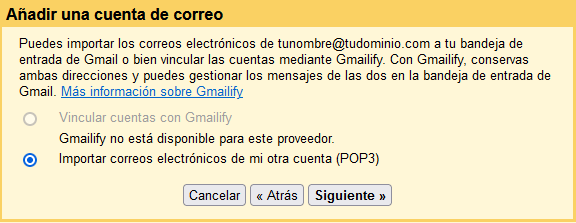 Nota importante: Al agregar tu cuenta de correo a gmail.com, los correos que recibas se borrarán del servidor y solo estarán disponibles a través de gmail.com. Esto te permitirá ahorrar espacio en tu servidor.