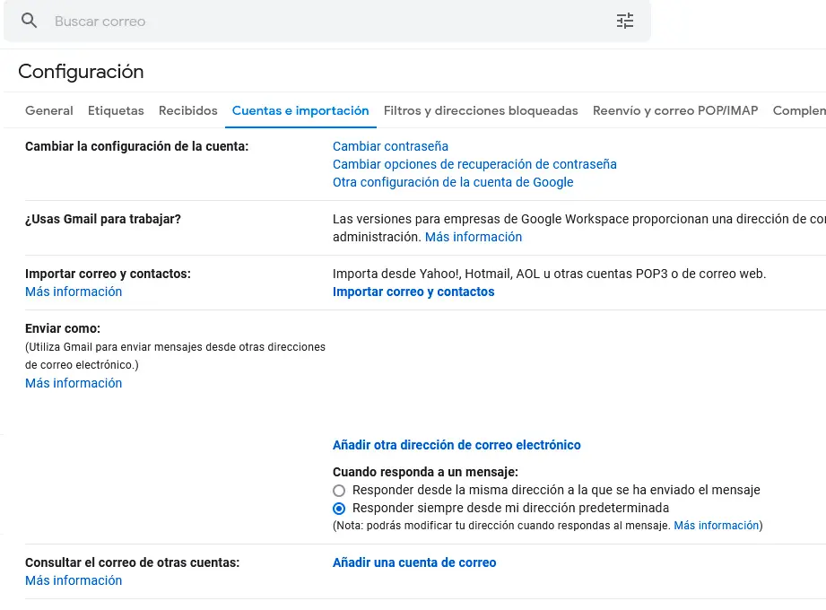A continuación, en la sección Consultar el correo de otras cuentas, haz click en "Añadir una cuenta de correo".