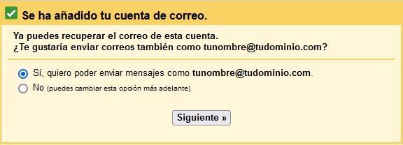 Para poder enviar correos desde gmail.com con tu correo marca la opción Sí, quiero poder enviar mensajes como... y haz click en Siguiente.